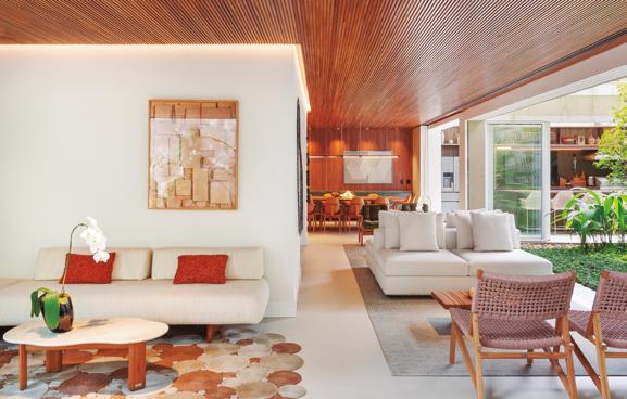 A luz natural, favorecida pelas grandes janelas, reforça a sensação de leveza, enquanto a escolha da madeira Freijó