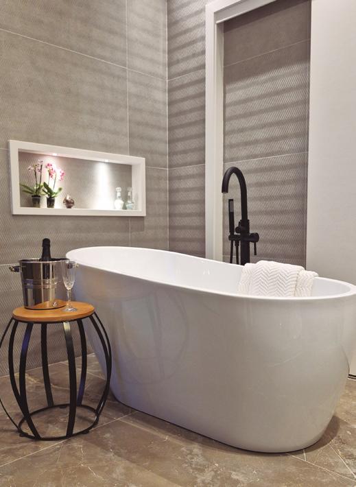 A suíte conta ainda com banheira de imersão e revestimento texturizado em tons de cinza. Nichos embutidos, iluminação focal e metais pretos criam um cenário de relaxamento que prolonga a sensação de bem-estar do projeto