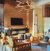 Com pé-direito duplo e lareira moderna, a sala de estar traduz o conceito hygge. O pendente geométrico em LED e o painel amadeirado com TV formam o ponto focal, enquanto o mobiliário em tons neutros e texturas naturais reforça o conforto visual