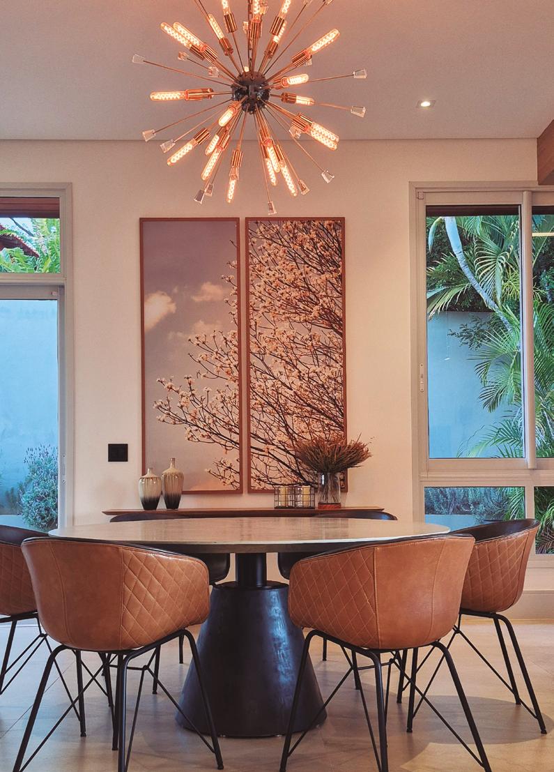 Na sala de jantar, o lustre sputnik se destaca sobre a mesa de base escultórica. Painéis com galhos decorativos e cadeiras em tom caramelo complementam a paleta terrosa, enquanto as amplas janelas reforçam a conexão com a paisagem
