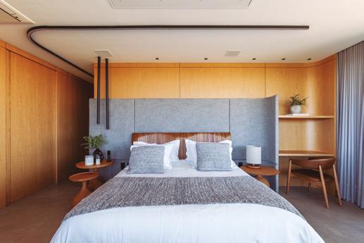Com vista para a área de lazer, a suíte se abre para a natureza. O painel de madeira natural, da cabeceira ao teto, cria continuidade visual, enquanto a iluminação suave reforça a atmosfera acolhedora e contemplativa