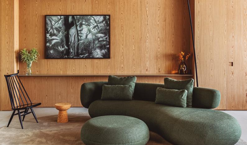 O sofá modular EOS da Artefacto, em verde musgo, traz frescor e personalidade ao estar secundário. O painel contínuo em madeira natural cria um pano de fundo sereno, valorizado pela fotografia botânica em preto e branco que reforça o diálogo entre design e expressão artística