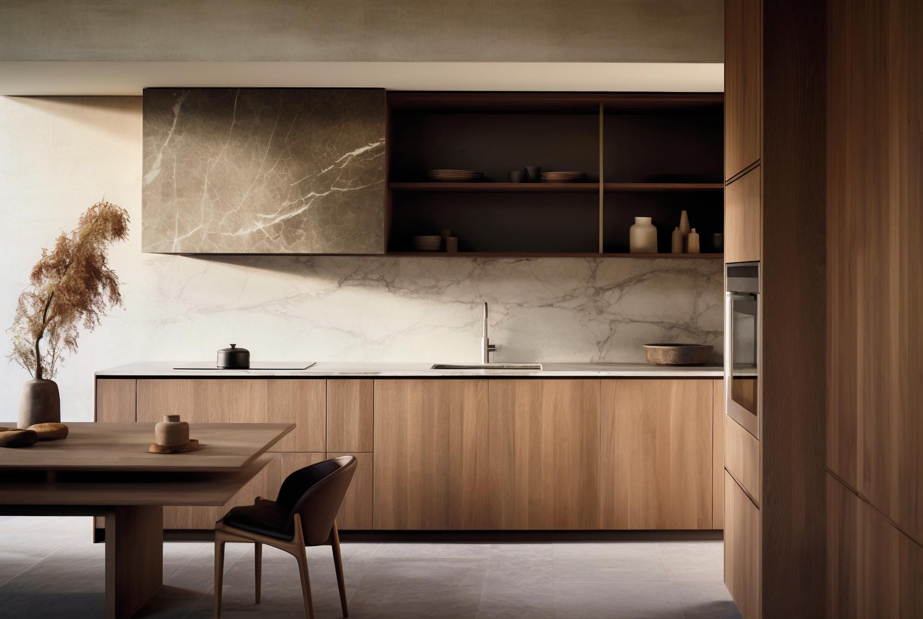 Tons quentes e texturas suaves definem a cozinha, onde o revestimento Gouache da Portobello na parede harmoniza com os armários em laca nude e bancada em granito
