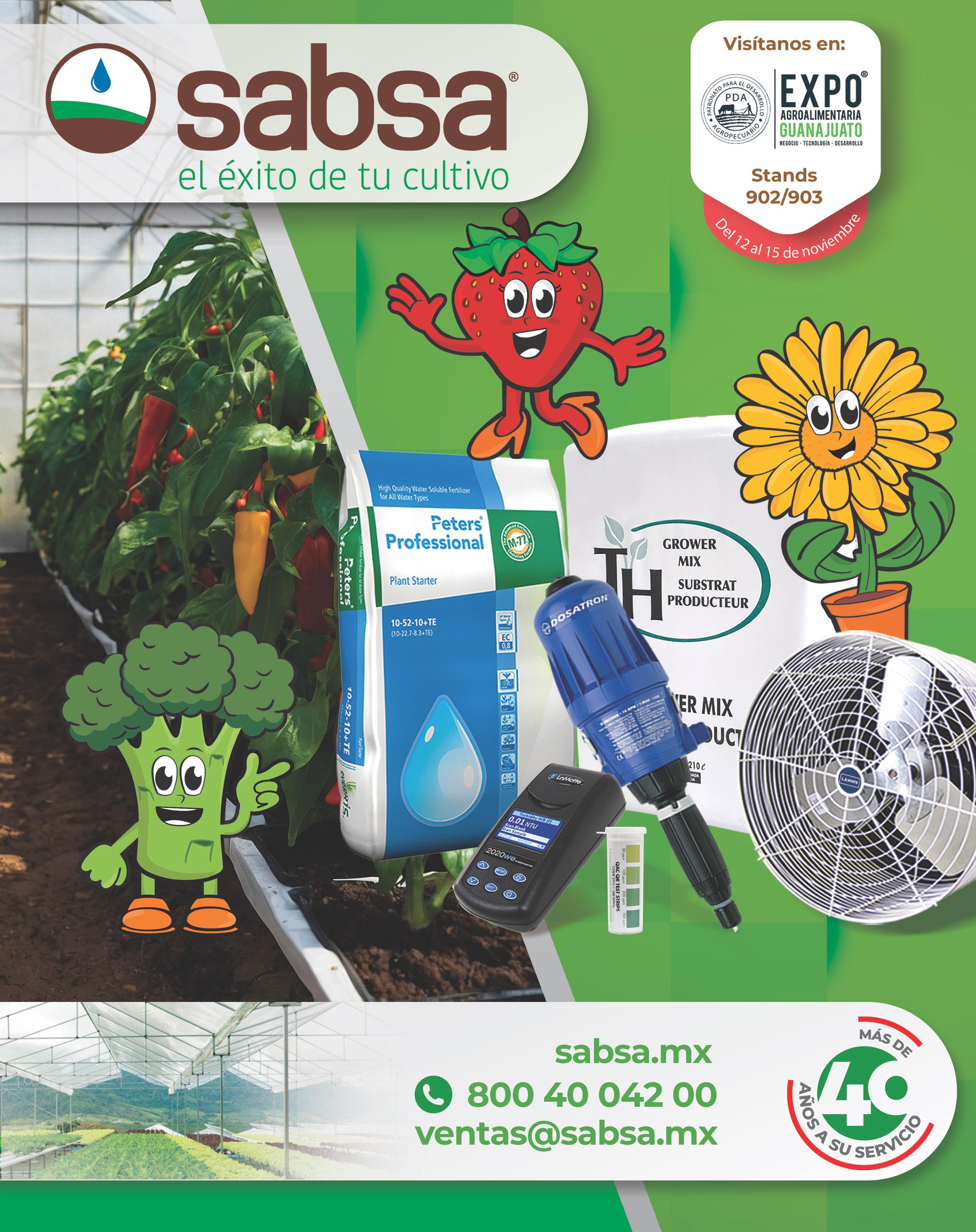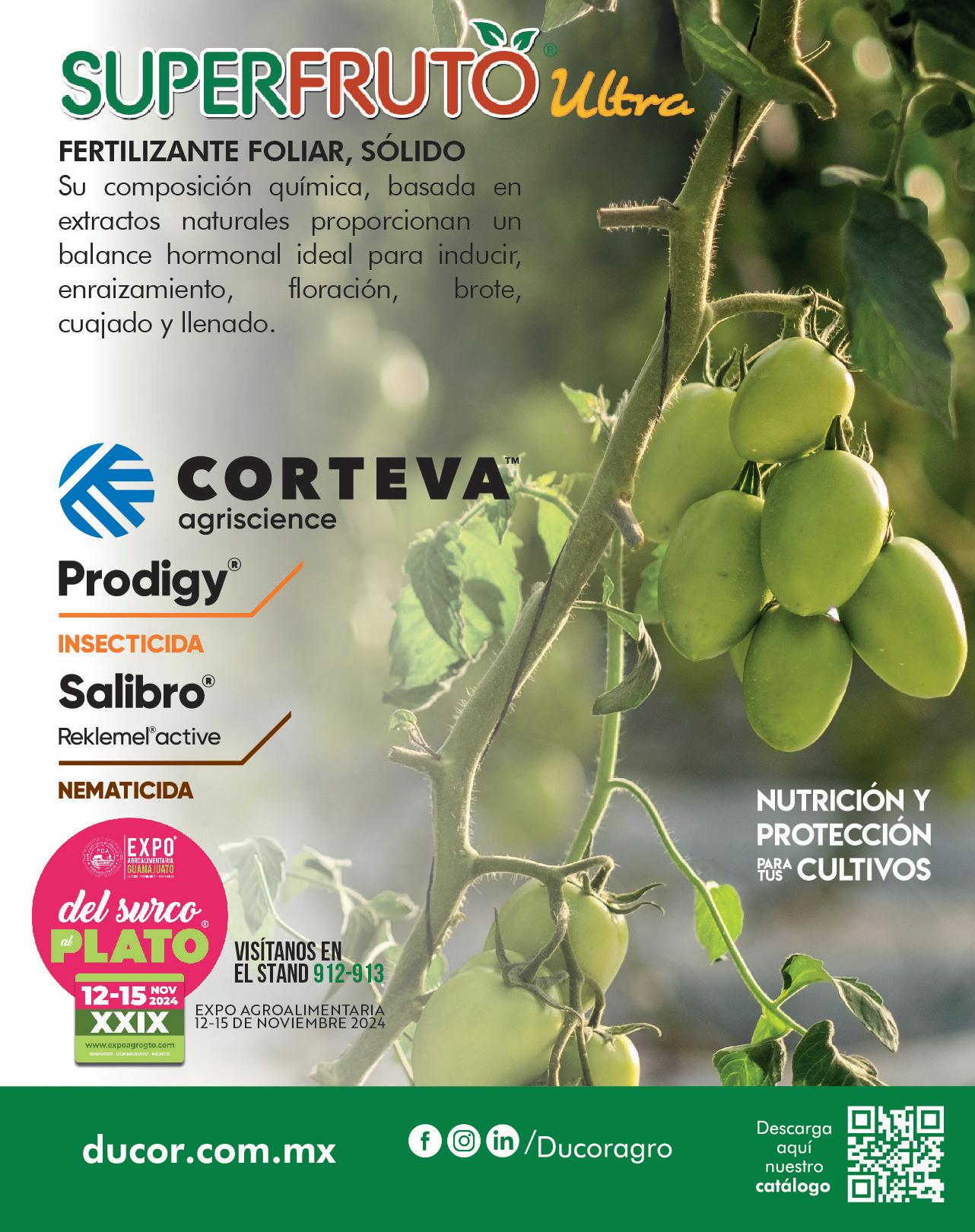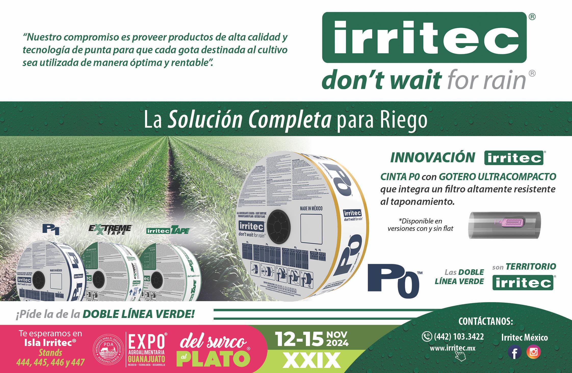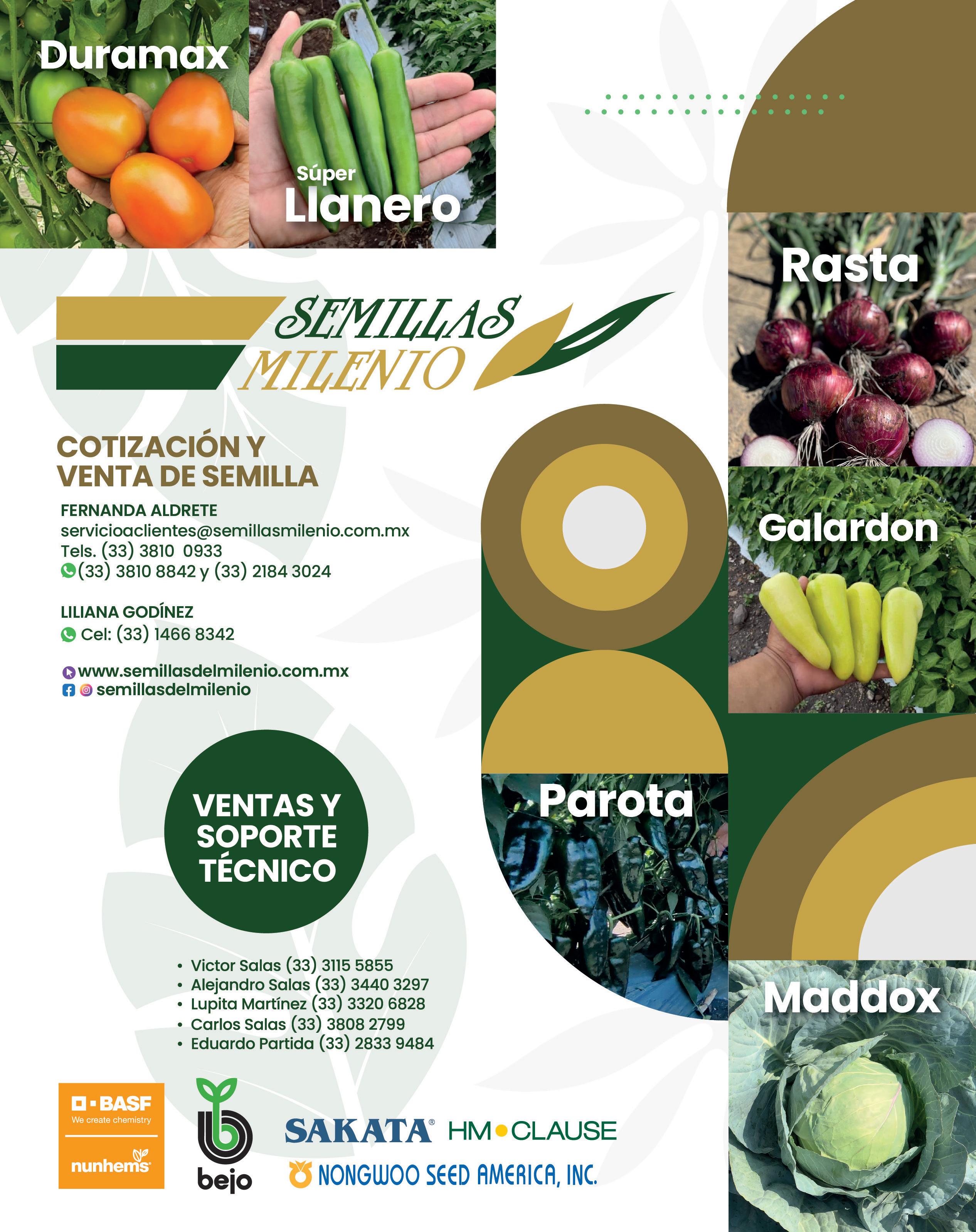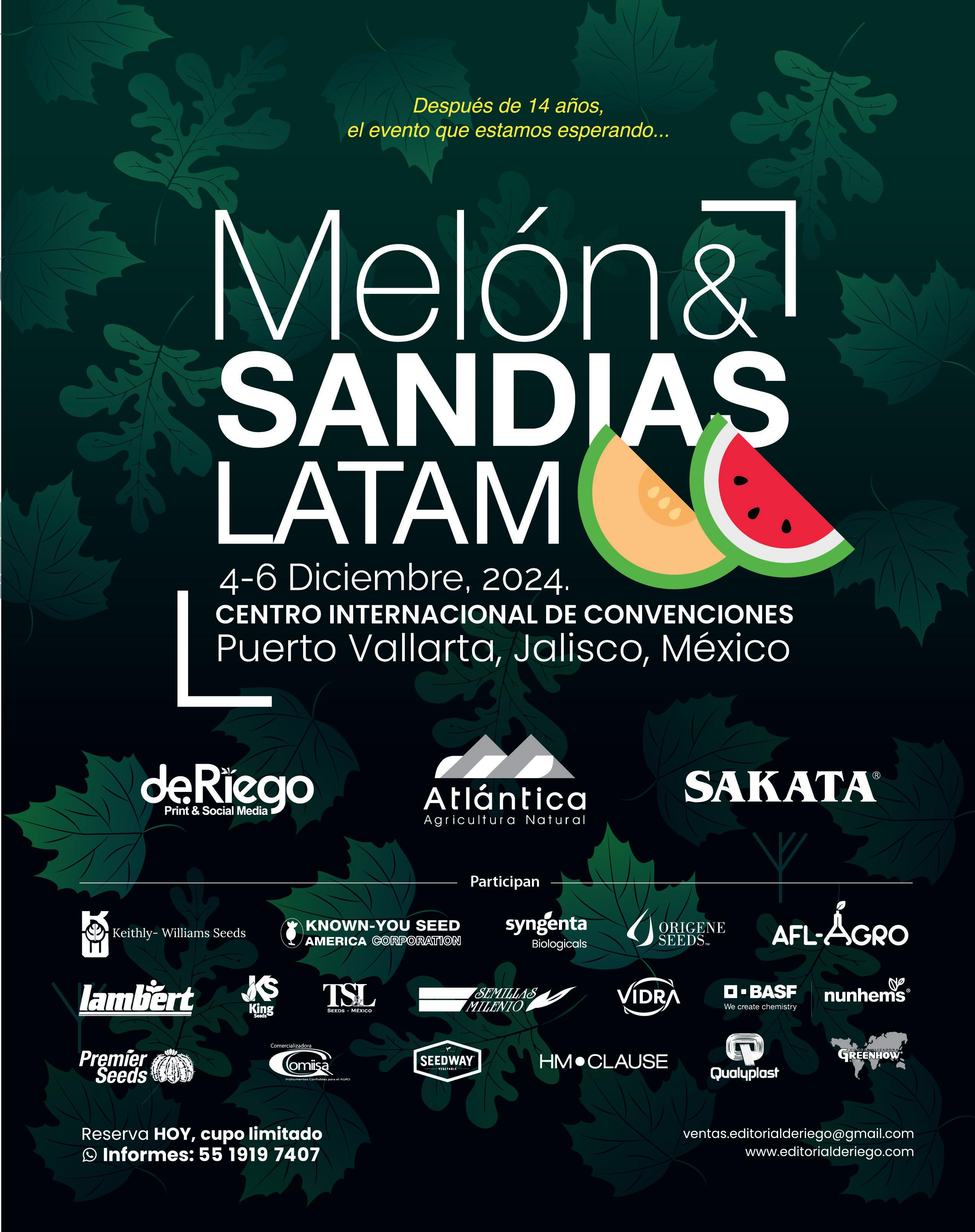 deRiego, Año 24 Nº 136, Octubre - Noviembre, 2024, es una publicación especializada, editada por EDITORIAL DERIEGO, S.A. DE C.V., enfocada al sector agrícola. Se encarga de difundir las más avanzadas tecnologías de riego, nutrición y protección para la producción de hortalizas y frutas. deRiego se publica bimestralmente en los meses de diciembre, febrero, abril, junio, agosto y octubre. El costo del ejemplar es de $60.00 MXN, y la suscripción por 1 año es de $380.00 MXN / $95.00 USD. Tiraje de 12 mil ejemplares, distribuidos y editados para productores activos, profesionales, investigadores y académicos involucrados directamente en el sector; e instituciones oficiales y privadas. Certificado de reserva de derechos: 04-2011-072210295800102. Certificado de Título y Contenido 15802. Registro SEPOMEX: PP09-1923. Los artículos publicados son responsabilidad de cada autor. deRiego no tiene injerencia en su contenido. Queda prohibida la total o parcial reproducción del contenido sin previa autorización por escrito del Director General.