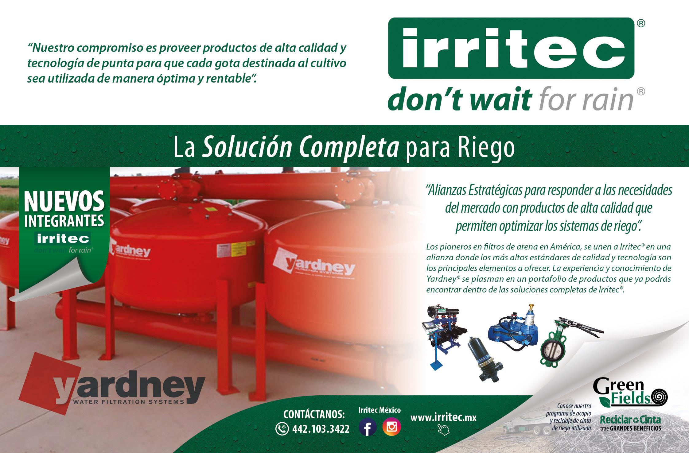 deRiego, Año 21 Nº 127, Abril-Mayo de 2023, es una publicación especializada, editada por EDITORIAL DERIEGO, S.A. DE C.V., enfocada al sector agrícola. Se encarga de difundir las más avanzadas tecnologías de riego, nutrición y protección para la producción de hortalizas y frutas. deRiego se publica bimestralmente en los meses de diciembre, febrero, abril, junio, agosto y octubre. El costo del ejemplar es de $60.00 MXN, y la suscripción por 1 año es de $380.00 MXN / $95.00 USD. Tiraje de 12 mil ejemplares, distribuidos y editados para productores activos, profesionales, investigadores y académicos involucrados directamente en el sector; e instituciones oficiales y privadas. Certificado de reserva de derechos: 04-2011-072210295800-102. Certificado de Título y Contenido 15802. Registro SEPOMEX: PP09-1923. Los artículos publicados son responsabilidad de cada autor. deRiego no tiene injerencia en su contenido. Queda prohibida la total o parcial reproducción del contenido sin previa autorización por escrito del Director General.