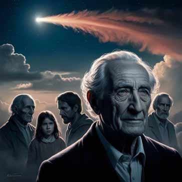 A falta de minutos para el impacto, el hombre llegó a la morada del viejo, quien se encontraba disfrutando del paisaje por fuera de su pequeña casa. Una niña recogía flores de la maleza en jardín y las colocaba con inocencia al costado del anciano. Inmerso en la serenidad, recibió al hombre con una compleja mirada, el trajeado observaba el panorama proyectado detrás del abuelo: un cometa que vaticinaba el dulce dolor que se intrusaba del ocaso aquella tarde. El hombre tomó asiento a un lado del viejo,
