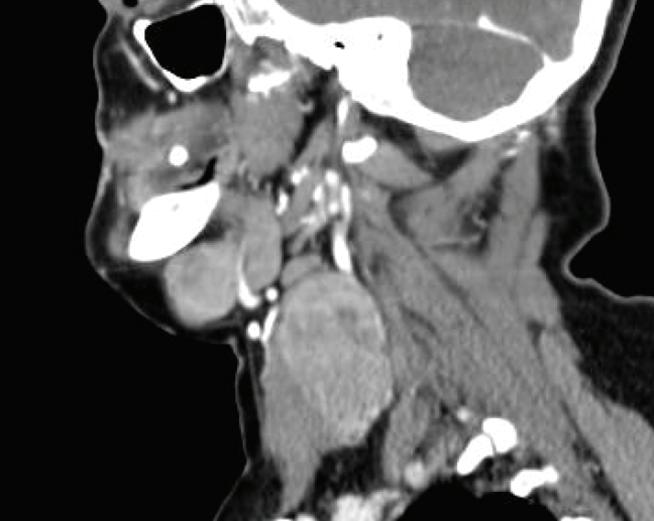 Figura 8. Se realiza tomografía de cerebro y cuello con contraste endovenoso. En región parótida, submaxilar y espacio carotídeo en región infrahioidea derecha, se observan lesiones de densidad partes blandas, con realce intenso, heterogéneo, tras la administración del contraste endovenoso, de tamaño variable, algunos expansivos que generan desplazamiento y compresión de estructuras adyacentes.