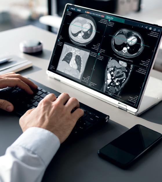 Desarrollado e implementado en la nube, PACSonWEB le of rece todos diagnóstico y distribución en remoto, y mayor colaboración con intercambio de información en tiempo real.