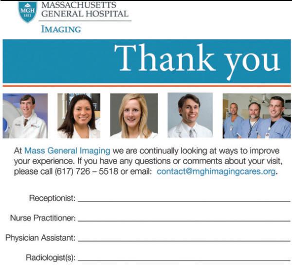 Figura 3. Tarjeta de agradecimiento que la institución de los autores ha iniciado distribuir a los pacientes después de un examen. Informativo similar material sobre el examen del paciente en particular y radiólogos en general se podrían proporcionar a todos los pacientes después de sus exámenes.