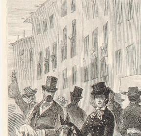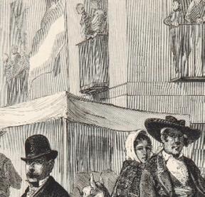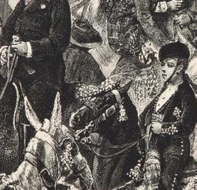 Un testimonio interesante del privilegio que tenían los cerdos de san Antón para campar a sus anchas por las calles de Madrid lo aporta Mesonero Romanos8 en su obra «El Antiguo Madrid» cuando alude a la excelente descripción de un escritor anónimo que en 1746, año en que sucedió en el trono a Felipe V, su hijo Fernando VI, hizo llegar al gobernador un amplio documento donde especificaba las características y deficiencias de la Villa. Antonio Flores9 relata con cierta gracia cómo las denominadas «vueltas de San Antón es una fiesta consagrada a la memoria del burro, y él es el héroe de la broma». Alude a que los habitantes de la Villa son conscientes de que en ese señalado día las caballerías se solazan y se divierten por las calles de la capital y que«...Ni el fogoso alazán de parada, ni la envilecida yegua de tiro, ni el castigado macho de carga, ni la resignada mula de tahona, ningún cuadrúpedo... falta a la invitación...» Flores analiza el esplendor y ornamentación de la calle Hortaleza y la terminación de la Festividad al ponerse el sol, en que los cuadrúpedos tienen que retornar a su existencia cotidiana, después de haber sido los protagonistas de ese día en que su gloria efímera solo se ha circunscrito a ese breve periodo de tiempo, cuando menciona en latín la frase: Sic transit gloria mundi , que se traduce en castellano por “Así pasa la gloria por este mundo”.