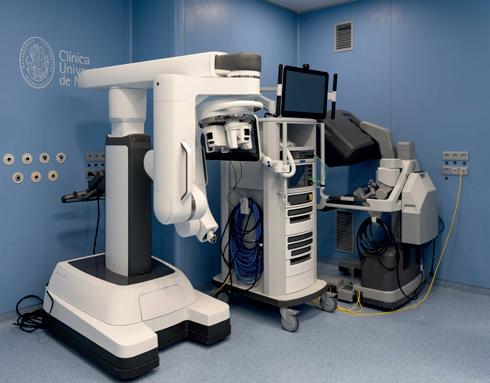 novación que permite realizar toda la operación a través de una sola incisión. Esta tecnología facilita intervenciones más precisas y menos invasivas en especialidades como Urología, Cirugía General, Cirugía Torácica u Otorrinolaringología, reduciendo el dolor postoperatorio y acelerando la recuperación del paciente. En Pamplona, se incorporará un Da Vinci XI, la evolución del equipo con el que la Clínica ha realizado ya casi 3.000 operaciones en los últimos quince años. Asimismo, el nuevo robot Mako se sumará a la lista de avances quirúrgicos para la cirugía ortopédica y traumatológica. Este sistema, utilizado en Estados Unidos para operaciones pioneras de columna y hombro, empezará a emplearse en intervenciones de rodilla y cadera.