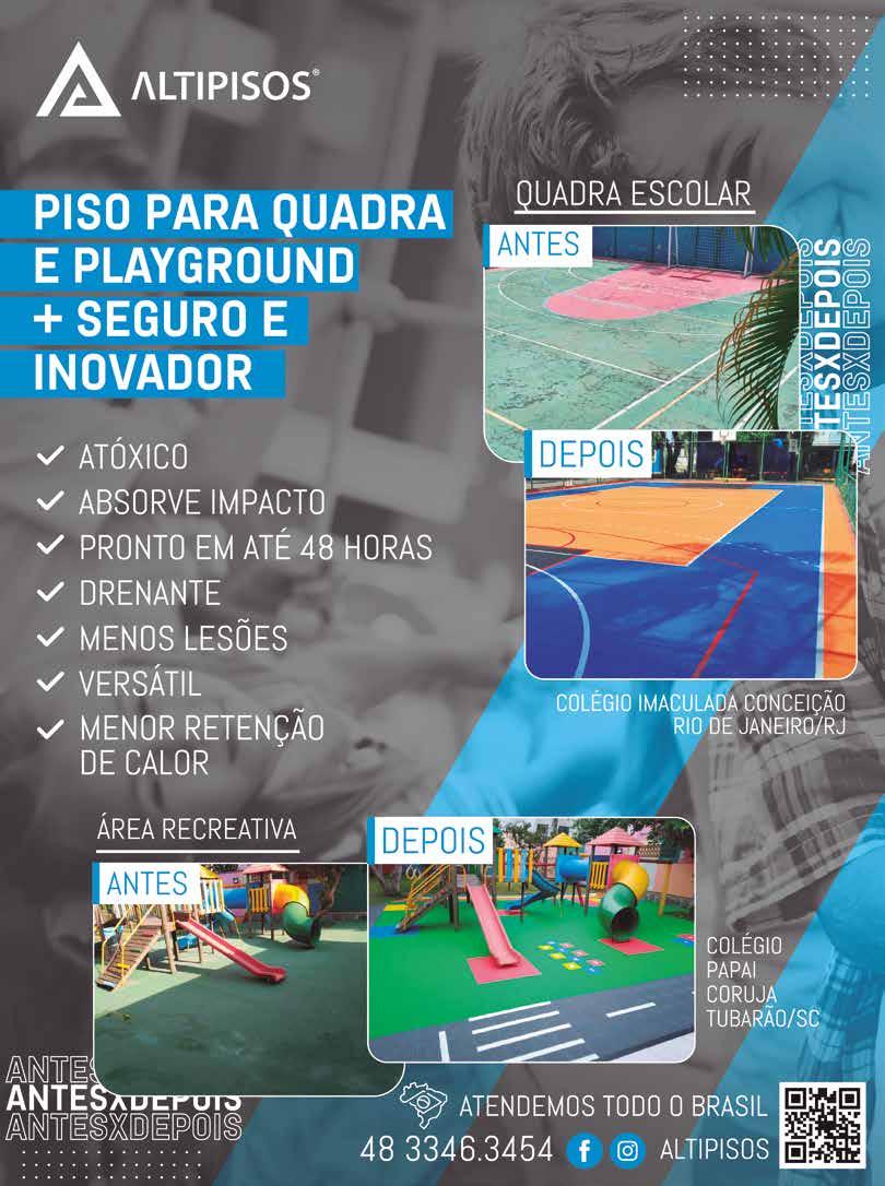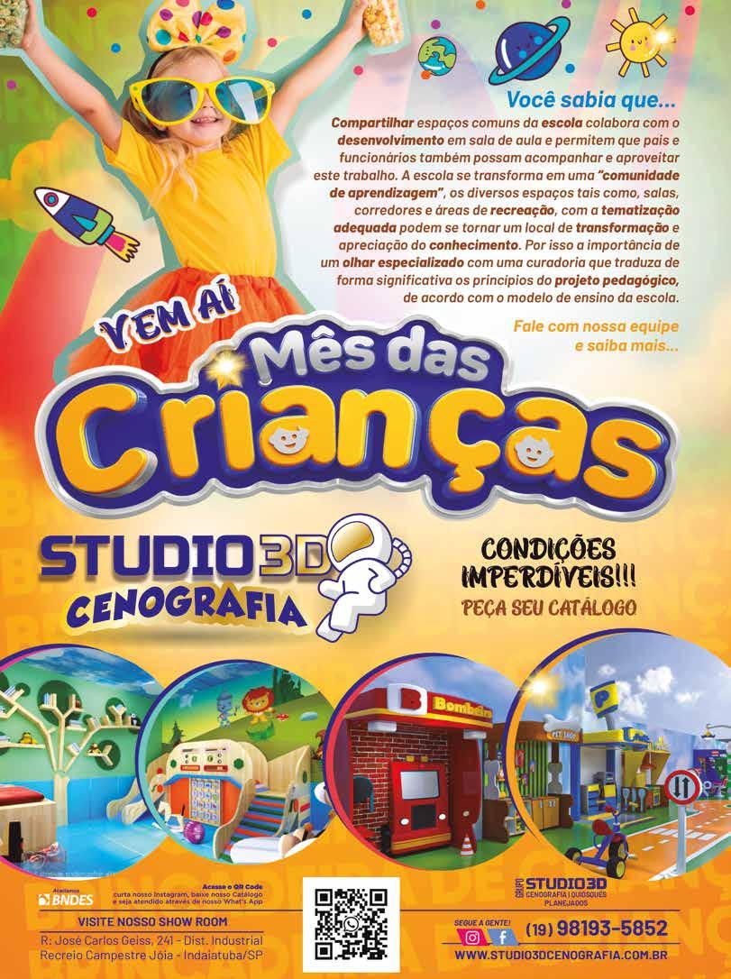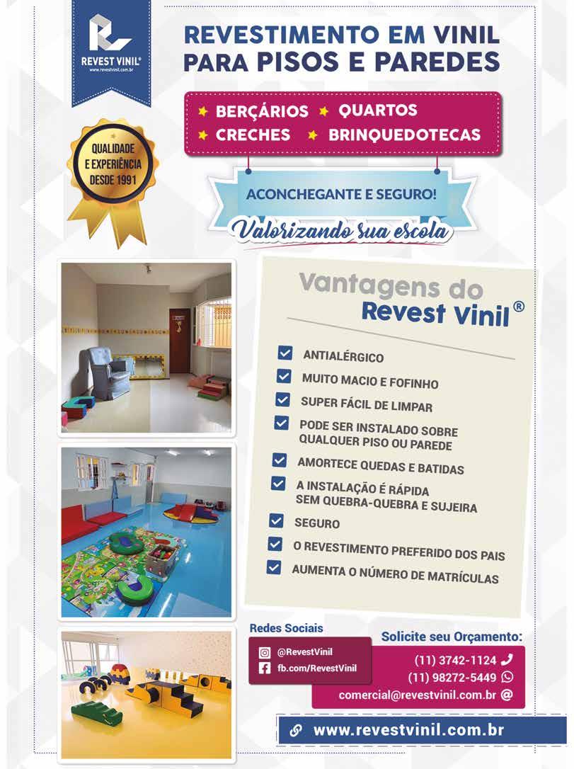de móveis seguros, pisos e paredes protegidos, tendo em vista a construção do berçário como um ambiente independente e seguro para a cir culação livre dos bebês. Nos últimos anos, com a pandemia de Covid-19, os cuidados e as preocupações com a higiene e a limpeza dos espaços escolares se intensifi caram, ressaltando a procura por pisos, móveis ou materiais que facilitem a higienização. Nos berçários, em especial, Shirley destaca que materiais lisos, impermeáveis e de fácil higieni zação são opções que proporcionam conforto para as crianças andarem e engatinharem com segurança. “Produtos biodegradáveis e de fácil evaporação, antibacteriano e ação germinada completa que tenham autorização pela Anvi sa”, continua a empresária, são algumas dicas para a limpeza do espaço. berçário, além de ser o primeiro contato social dos bebês, é um espaço rico em experiências e desenvolvimentos sensorial, psi comotor, cognitivo e afetivo, fortalecendo estí mulos e movimentos por meio de uma relação fluida. Para escolher um ambiente confortável e agradável para os bebês, certos pré-requisitos devem ser analisados criteriosamente. Shirley Viana, empresária do setor, indica que um bom planejamento é fundamental “e mui to importante para um berçário de sucesso, levando em consideração seus objetivos e as possibilidades atuais e tudo o que pretende em relação a estrutura, ficando atento às exigên cias das leis do seu município”. Durante o pro cesso de planejamento, deve-se levar em conta, também, outras características, como a escolha Além da aliança entre limpeza e segurança, do ponto de vista físico, abrigar ambientes distintos para os momentos da recreação, da alimentação, da higienização e do sono pos sibilita a estruturação e o planejamento de ro tina – tanto para os bebês como para os pro fissionais que o cercam. E, caso o/a gestor/a escolar, tenha interesse em criar um berçário na sua instituição, a principal dica de Shirley é procurar empresas que trabalhem com mate riais especializados para essa faixa etária, que não exijam manutenção diária e proporcione segurança e cuidado com os bebês. (RP)
