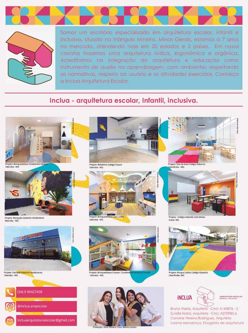 O ambiente construído escolar, diz a arquiteta Bruna Vieira de Assis, proporciona um espaço pronto para acolher o usuário, promovendo os desenvolvimentos educacional, social e cognitivo. “A arquitetura voltada para educação torna-se fundamental para criar espaços que abrigam as metodologias educacionais através da estética, forma e função. Arquitetura escolar tem como uma de suas especialidades traduzir em ambientes memórias, métodos e história, proporcionando ambientes inclusivos, personalizados, acolhedores, lúdicos e que respeitem a faixa etária e atividade exercida no espaço”, complementa Bruna, responsável por um escritório mineiro especializado em projetos arquitetônicos educacionais.