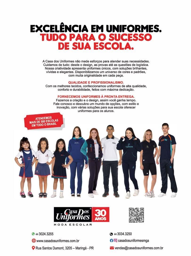 Para gestores/as que pretendem reformular os uniformes da instituição, Valdeci destaca que a escolha de uma empresa (para a criação, produção e revenda dos uniformes) é essencial, com especial atenção na qualidade e o f erta dos uniformes. “Vemos a logística como um dos grandes problemas das empresas de uniformes, ou seja, oferecer os uniformes aos pais a pronta entrega durante todo o ano. Caso a escola não opte por uma empresa idônea e com boas referências, acaba tendo problemas com pais e estudantes no uso diário dos uniformes”, finaliza. (RP)