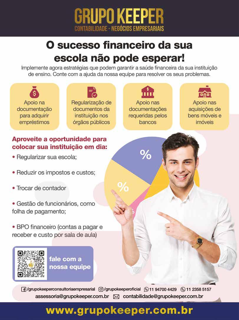 primeiro semestre de 2024, trouxemos alguns destaques que estiveram presentes nos quatro dias da Bett Brasil, considerado o maior evento de inovação e tecnologia para educação na América Latina. Além dos destaques, nesta edição você também encontra matérias sobre arquitetura escolar, uniformes, lousa digital, e artigos de opinião de nossos renomados colunistas.
