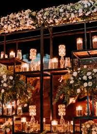 La decoración floral se compuso por rosas, gipsófilas, king proteas, orquídeas y follajes. El color de la decoración floral contrastaba y a la vez se armonizaba a la paleta tonal monocromática con detalles dorados.