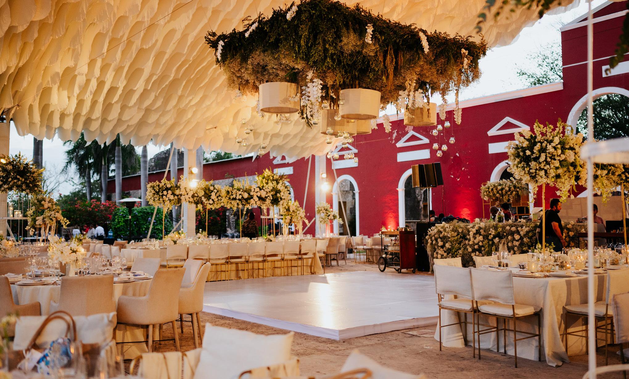 El gran día comenzó con una ceremonia en los jardines de la hacienda en donde los novios intercambiaron sus votos, para después dar paso a un coctel de bienvenida en el área de las piscinas, donde se consintió a los invitados con canapés y bebidas. Posteriormente, en el cuarto de máquinas de la hacienda, se sirvió la cena. La decoración