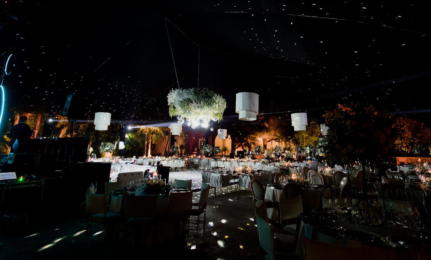 Sin lugar a dudas uno de los hot spots de la noche fue la decoración área de la pista de baile diseñada especial mente para la ocasión y que consistió en un maxi colgante del que brotaban hileras de flores blancas y diferentes tipos de follaje verde.