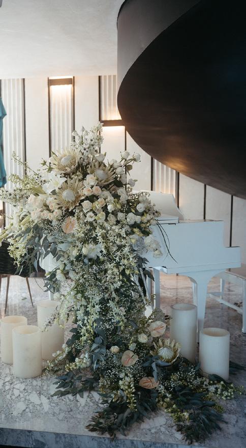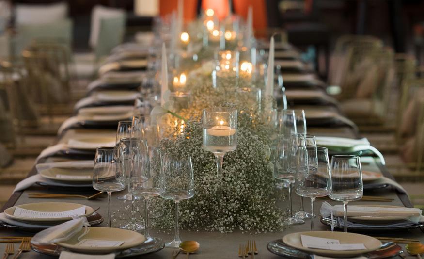 personalidad de los novios, creando una atmósfera fresca y relajada. Mesas y sillas de madera de diferentes estilos combinadas con mantelería en tonos neutros fueron distribuidas debajo de una maxi carpa. Pudimos ver tabletops con vajilla blanca y detalles dorados, así como cristalería en color ámbar. Los centros de mesa fueron arreglos florales totalmente boho-chic; diferentes variedades de rosas en tonos salmón y rosado, pampa grass, abanicos de hoja seca de palma y follaje verde.