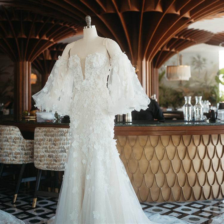 Colección Grazia 2024 línea sirena strpaless con tela bordada de plumas con destellos de brillo.