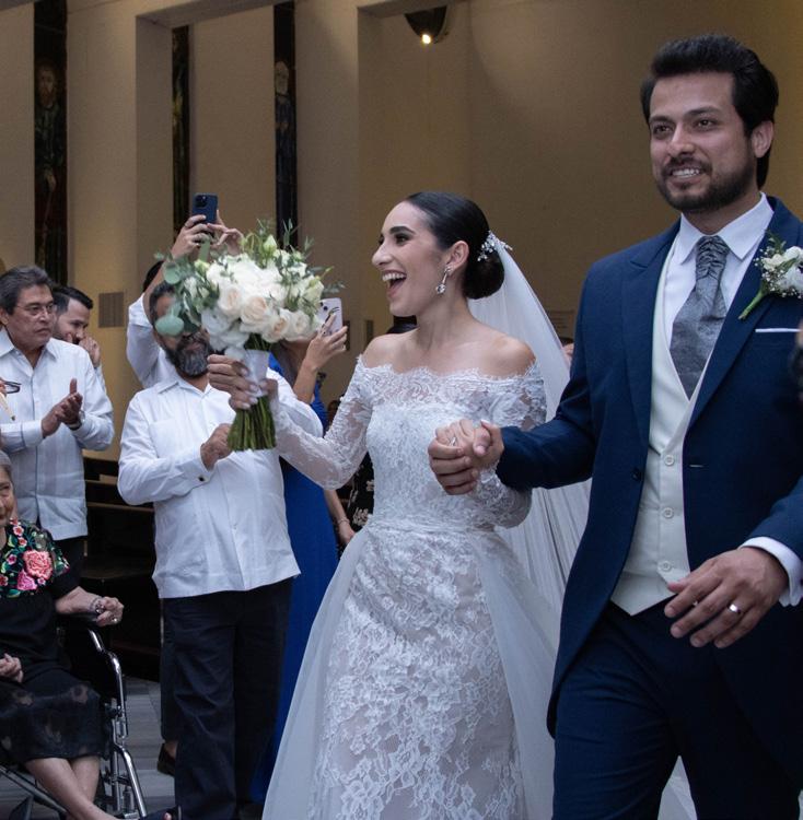 decoradas con centros de mesa a base de rosas y mini rosas en colores vivos, como el salmón y el amarillo. El exquisito menú que disfrutaron tanto los novios como sus invitados fue totalmente regional; de entrada se sirvieron mini mucbilpollos, brazo de reina, tostón de plátano macho con dzik de venado, dzikilpac y frijol refrito con costra de longaniza. El plato fuerte lechón, cochinita y escabeche oriental. El postre, un original pastel de yemitas.