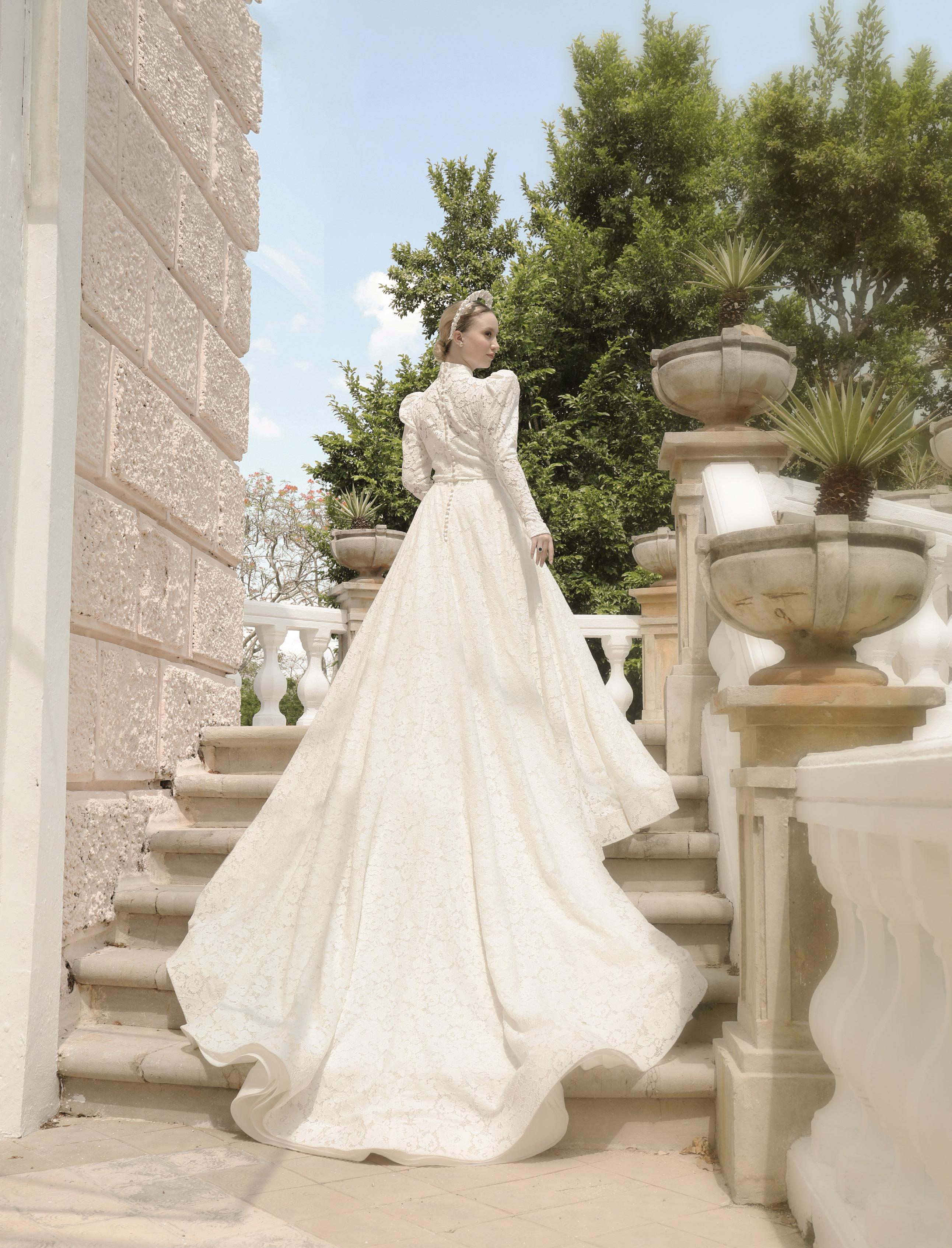 Vestido Paulina Vestido de colección Grazia 2024 línea princesa manga larga con chantilly francés y sobre bordado de encaje ingles texturizado; escote corazón profundo
