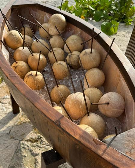 El montaje, principalmente en madera y colores neutros, estaba cobijado por una maxi carpa de grandes olas de tela, quesemovíanlibrementealcompásdelabrisa.Ladecoración enmarcada por grandes estructuras naturales y un colgante sobre la pista que fueron elaborados con materiales orgánicos y texturas naturales como la paja y el bambú, elementos que sin duda fueron la apuesta perfecta para darle un toque espectacular. Las mesas y sillas de madera, manteles de yute, flores exóticas como aves de paraíso, flores de maraca, proteas, anturios, alpinias purpuratas, boca de dragón y heliconias entre otras, en tonos vibrantes, las palmeras y la brisa del mar se sumaron como testigos de un sí, acepto mega romántico, íntimo y con una vibra especial. Para dar a los invitados una refrescante bienvenida, se ofrecieron cocos personalizados con el wedding brand de los novios. Así mismo un espectacular candy bar con petit fours como alfajores, brownies, pay de limón, galletas con chispas de chocolate, caramel chocokrispies, etc. Así como variedad de snaks como brochetas de gomitas enchiladas, cacahuates, charritos. El menú estuvo conformado por Carpaccio betabel