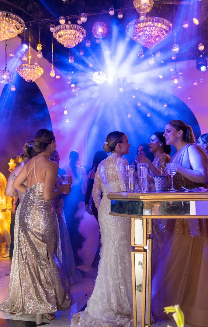 protagonistas. Lámparas de fibras naturales de gran tamaño colgaban del techo sobre una pista de baile tipo checkers en color blanco y beige, mientras que el mobiliario se mantenía en la paleta de colores ya mencionada con elementos de fibras naturales y madera; los centros de mesa eran arreglos florales realizados con alcatraces, orquídeas, rosas, lisianthus, hortensias y claveles en color blanco impoluto.