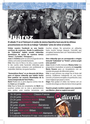 muchos amigos. No pensamos en utilizarlas hasta mucho tiempo después. Coincidió que encajaban bastante bien con “Automáticos Reno” y aprovechamos. Otro videoclip que no corresponde a ningún tema de “Caléndula” es “Visión”. ¿Cómo surgió esta canción? Jose: Desde el sello mexicano Música Solar nos propusieron musicalizar un poema de Leopoldo María Panero para un recopilatorio con un montón de grupos de diferentes países. Cris: Lo que primero nos atrajo fue el título del poema, estábamos trabajando en una nueva canción y el poema encajaba a la perfección, esas cosas mágicas que pasan a veces. Iñigo: Para grabar el vídeo nos fuimos con un montón de amigos un día a la nieve. Estuvo genial. Vuestro propio nombre sugiere una conexión con México. ¿Qué os sugiere ese país?