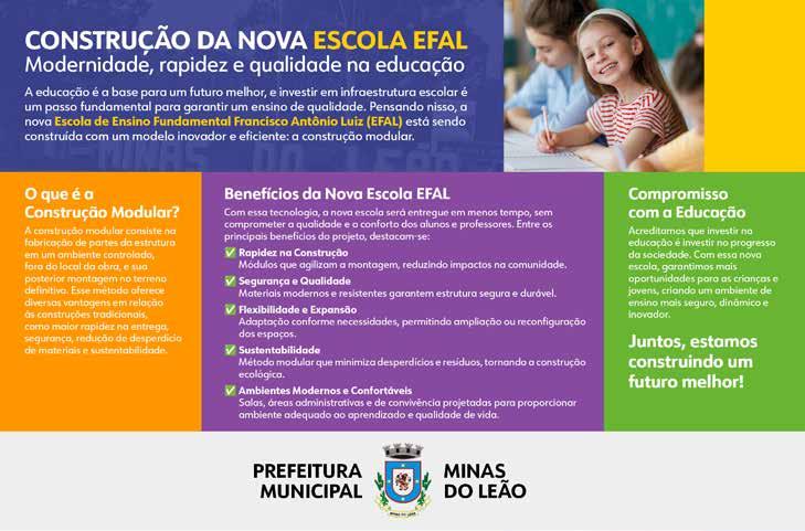 Agora, nós estamos na finalização da construção de uma nova Unidade Básica de Saúde (UBS) e um Centro Administrativo de Saúde. Nós queremos levar médicos especialistas, principalmente, de Cardiologia. Minas do Leão possui um diferencial, possuímos urgência e emergência 24 horas, somos uma cidade pequena, mas que há 30 anos dispõe desse serviço.