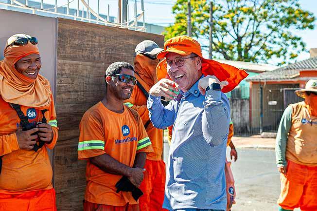 sucedido. Ele credita os avanços de Canoas ao trabalho em equipe e à “união de todos pelo bem comum”, mas não esconde o orgulho de ver a cidade recuperar sua autoestima e protagonismo. Na foto, prefeito atende concidadãos durante o programa “Gabinete Aberto”