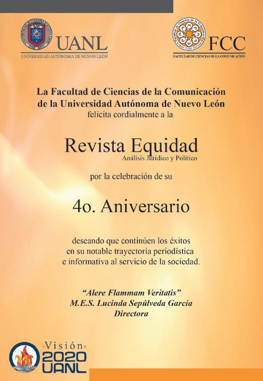 EQUIDAD, es una revista mensual con registro en trámite con un tiraje de 2000 ejemplares y tiene su circulación en todas las dependencias de los tres niveles de Gobierno ligadas al área jurídica, en las Escuelas de Derecho de las diversas Universidades del Estado de Nuevo León, Notarías Públicas, despachos de Abogados de todas las especialidades, Colegios de Abogados. También su distribución comprende todas las instancias políticas tanto municipales como estatales. Los artículos firmados son responsabilidad de su autor y no reflejan necesariamente la línea editorial de este medio. Cel. 811-544-9646 Nextel: 1773-7895