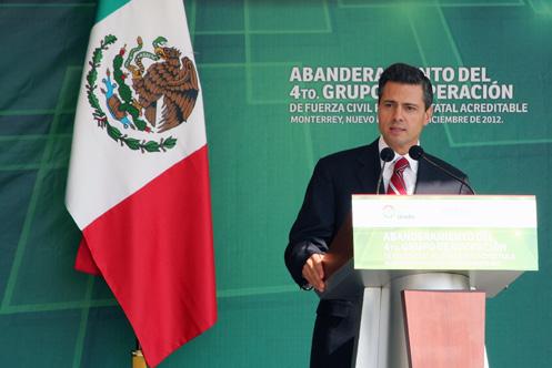 En su primera visita a Nuevo León ya como Presidente de la República, Enrique Peña Nieto, además de anunciar la coordinación que se dará entre la Federación y el Estado, encabezó el abanderamiento del Cuarto Grupo Operativo de Fuerza Civil, a la que reconoció por su incansable labor y buenos resultados.