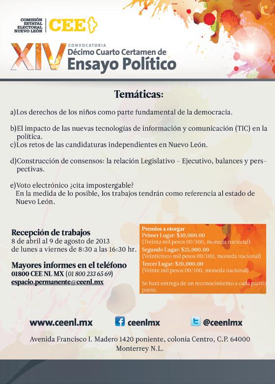 DISEÑO EDITORIAL EQUIDAD ANÁLISIS JURÍDICO Y POLÍTICO, es una Revista mensual con número de Certificado de Reserva de Derechos al Uso Exclusivo del Títutlo EQUIDAD ANÁLISIS JURÍDICO Y POLÍTICO 04-2012-041914200700-102, de fecha 19 de Abril del 2012, expedido por el Instituto Nacional de Derecho de Autor. Su circulación comprende todas las Dependencias de los tres niveles de Gobierno ligadas al área jurídica y política; Escuelas de Derecho de las diversas Universidades del Estado; Notarías Públicas, Despachos de Abogados; Colegios de Abogados. También su circulación comprende todas las instancias políticas tanto municipales como estatales. Los artículos firmados son responsabilidad de su autor y no reflejan necesariamente la línea editorial de este medio. Tels. 1773-7895 y 811-544-96-46. e-mail: ajc_carrizales@msn.com / reynaldo_lozano_cavazos@yahoo.com. Dirección: Platón Sánchez 711 Norte, Centro, C.P. 64000, Monterrey, N. L.