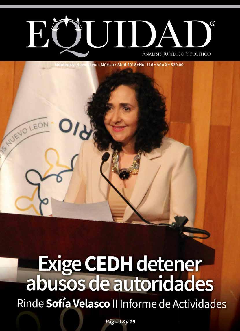 EQUIDAD ANÁLISIS JURÍDICO Y POLÍTICO, Revista Mensual. ABRIL 2018. Editor responsable: RAÚL CARRIZALES GONZÁLEZ. Certificado de Reserva de Derechos al Uso Exclusivo del Título EQUIDAD ANÁLISIS JURÍDICO Y POLÍTICO No. 04-2012-041914200700-102, otorgado por el Instituto Nacional del Derecho de Autor, de fecha 19 de abril del 2012 (vigente). Número de Certificado de Licitud de Título y Contenido 16268, expedido por la Comisión Calificadora de Publicaciones y Revistas Ilustradas de la Secretaría de Gobernación, de fecha 14 de Julio del 2014. EQUIDAD, es Marca Registrada con el número 1374245, de fecha 7 de Junio del 2013, expedido por el Instituto Mexicano de la Propiedad Industrial. Domicilio de la publicación: Platón Sánchez 711 Norte, Col. Centro, Monterrey, N. L. C.P. 64000. Impreso por Facsímil Arte Gráfico, S.A. de C.V., con domicilio en Félix U. Gómez No. 2818 Norte. Col. Cementos, Monterrey, N. L. C.P. 64520. Distribuidor: RAÚL