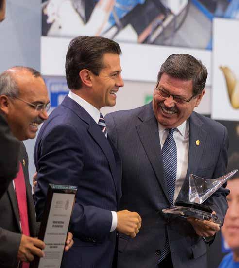 El Presidente de la República, Enrique Peña Nieto, entregó la presea de cristal al Rector de la UANL, Rogelio Garza Rivera, así como el diploma de reconocimiento al Director de la EIAO, Fernando Rodríguez Gutiérrez, durante el acto celebrado en la Residencia Oficial de Los Pinos.