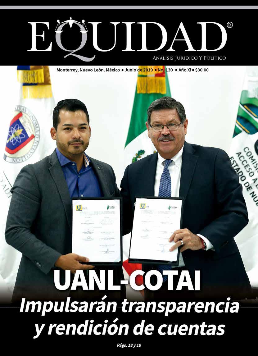 EQUIDAD ANÁLISIS JURÍDICO Y POLÍTICO, Revista Mensual. JUNIO 2019. Editor responsable: RAÚL CARRIZALES GONZÁLEZ. Certificado de Reserva de Derechos al Uso Exclusivo del Título EQUIDAD ANÁLISIS JURÍDICO Y POLÍTICO No. 04-2012-041914200700-102, otorgado por el Instituto Nacional del Derecho de Autor, de fecha 19 de abril del 2012 (vigente). Número de Certificado de Licitud de Título y Contenido 16268, expedido por la Comisión Calificadora de Publicaciones y Revistas Ilustradas de la Secretaría de Gobernación, de fecha 14 de Julio del 2014. EQUIDAD, es Marca Registrada con el número 1374245, de fecha 7 de Junio del 2013, expedido por el Instituto Mexicano de la Propiedad Industrial. Domicilio de la publicación: Platón Sánchez 711 Norte, Col. Centro, Monterrey, N. L. C.P. 64000. Impreso por Facsímil Arte Gráfico, S.A. de C.V., con domicilio en Félix U. Gómez No. 2818 Norte. Col. Cementos, Monterrey, N. L. C.P. 64520. Distribuidor: RAÚL CARRIZALES GONZÁLEZ (mismo domicilio de publicación). Tels. 1771-5141 y 811-544-96-46 e-mail: ajc_carrizales@msn.com