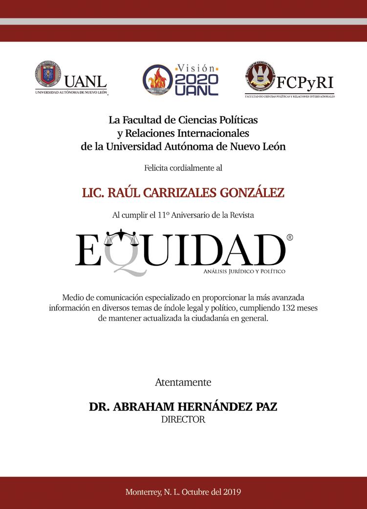 EQUIDAD ANÁLISIS JURÍDICO Y POLÍTICO, Revista Mensual. OCTUBRE 2019. Editor responsable: RAÚL CARRIZALES GONZÁLEZ. Certificado de Reserva de Derechos al Uso Exclusivo del Título EQUIDAD ANÁLISIS JURÍDICO Y POLÍTICO No. 04-2012-041914200700-102, otorgado por el Instituto Nacional del Derecho de Autor, de fecha 19 de abril del 2012 (vigente). Número de Certificado de Licitud de Título y Contenido 16268, expedido por la Comisión Calificadora de Publicaciones y Revistas Ilustradas de la Secretaría de Gobernación, de fecha 14 de Julio del 2014. EQUIDAD, es Marca Registrada con el número 1374245, de fecha 7 de Junio del 2013, expedido por el Instituto Mexicano de la Propiedad Industrial. Domicilio de la publicación: Platón Sánchez 711 Norte, Col. Centro, Monterrey, N. L. C.P. 64000. Impreso por Facsímil Arte Gráfico, S.A. de C.V., con domicilio en Félix U. Gómez No. 2818 Norte. Col. Cementos, Monterrey, N. L. C.P. 64520. Distribuidor: RAÚL CARRIZALES GONZÁLEZ (mismo domicilio de publicación). Tels. 1771-5141 y 811-544-96-46 e-mail:
