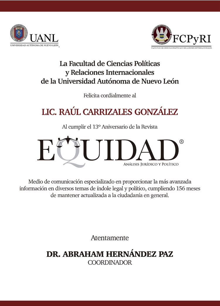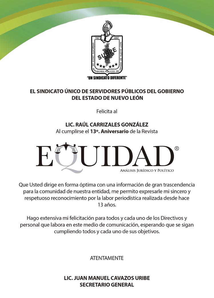 EQUIDAD ANÁLISIS JURÍDICO Y POLÍTICO, Revista Mensual. Octubre 2021. Editor responsable: RAÚL CARRIZALES GONZÁLEZ. Certificado de Reserva de Derechos al Uso Exclusivo del Título EQUIDAD ANÁLISIS JURÍDICO Y POLÍTICO No. 04-2012-041914200700-102, otorgado por el Instituto Nacional del Derecho de Autor, de fecha 19 de abril del 2012 (vigente). Número de Certificado de Licitud de Título y Contenido 16268, expedido por la Comisión Calificadora de Publicaciones y Revistas Ilustradas de la Secretaría de Gobernación, de fecha 14 de Julio del 2014. EQUIDAD, es Marca Registrada con el número 1374245, de fecha 7 de Junio del 2013, expedido por el Instituto Mexicano de la Propiedad Industrial. Domicilio de la publicación: Vasco de Gama 305 Col. Treviño, Monterrey, N.L., Monterrey, N. L. C.P. 64570. Impreso por Facsímil Arte Gráfico, S.A. de C.V., con domicilio en Félix U. Gómez No. 2818 Norte. Col. Cementos, Monterrey, N. L. C.P. 64520. Distribuidor: RAÚL CARRIZALES GONZÁLEZ (mismo domicilio de publicación). Tel. 8117715141 e-mail: ajc_carrizales@msn.com www.revista-equidad.com