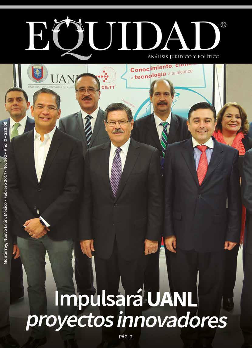 EQUIDAD ANÁLISIS JURÍDICO Y POLÍTICO, Revista Mensual. FEBRERO 2017. Editor responsable: RAÚL CARRIZALES GONZÁLEZ. Certificado de Reserva de Derechos al Uso Exclusivo del Título EQUIDAD ANÁLISIS JURÍDICO Y POLÍTICO No. 04-2012-041914200700-102, otorgado por el Instituto Nacional del Derecho de Autor, de fecha 19 de abril del 2012 (vigente). Número de Certificado de Licitud de Título y Contenido 16268, expedido por la Comisión Calificadora de Publicaciones y Revistas Ilustradas de la Secretaría de Gobernación, de fecha 14 de Julio del 2014. EQUIDAD, es Marca Registrada con el número 1374245, de fecha 7 de Junio del 2013, expedido por el Instituto Mexicano de la Propiedad Industrial. Domicilio de la publicación: Platón Sánchez 711 Norte, Col. Centro, Monterrey, N. L. C.P. 64000. Impreso por Facsímil Arte Gráfico, S.A. de C.V., con domicilio en Félix U. Gómez No. 2818 Norte. Col. Cementos, Monterrey, N. L. C.P. 64520.