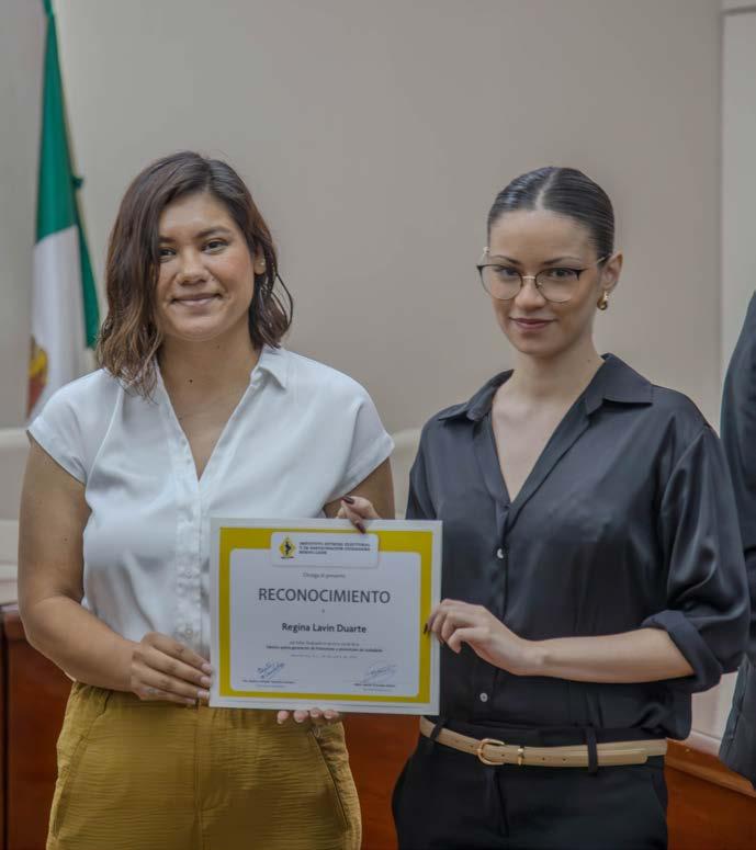 Piña Loredo, las Consejerías Electorales, Martha Martínez Garza, Alejandra Esquivel Quintero, Michael Alberto Banda Espinosa, y Diego Aarón Gómez Herrera; el Secretario Ejecutivo del IEEPCNL, Martín González Muñoz; y representaciones de universidades, entregaron reconocimientos a las y los estudiantes; así como un reloj a Óscar Sánchez Flores, por sensibilizar al mayor número de personas en esta generación; y a Lilia Guzmán Medina, con una tablet, por obtener el mayor alcance con un video en una dinámica en redes sociales.