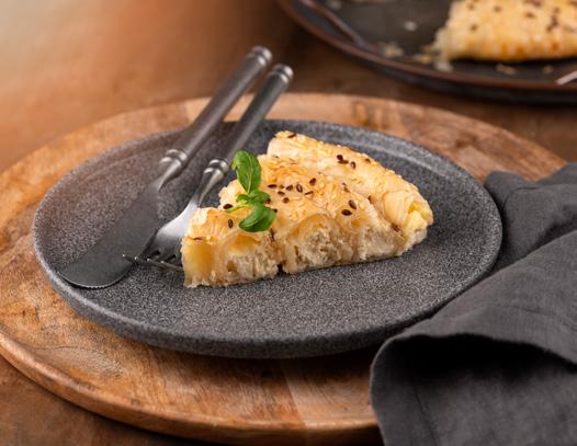 la base de hojaldre, conocida por su textura crujiente y su capacidad para mantener una estructura firme a pesar del relleno húmedo.