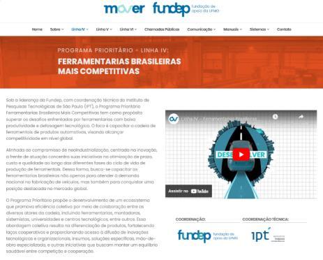 Sob a liderança da FUNDEP, com coordenação técnica do Instituto de Pesquisas Tecnológicas de São Paulo (IPT), o Programa Prioritário Ferramentarias Brasileiras Mais Competitivas tem como propósito superar os desafios enfrentados por ferramentarias com baixa produtividade e defasagem tecnológica O foco é capacitar a cadeia de ferramentais de produtos automotivos, visando alcançar competitividade em nível global. Alinhada ao compromisso de neoindustrialização, centrada na inovação, a frente de atuação concentra suas iniciativas na otimização de prazo, custo e qualidade ao longo das diferentes fases do ciclo de vida de produção de ferramentais Dessa forma, busca capacitar as ferramentarias brasileiras não apenas para atender à demanda nacional na fabricação de veículos, mas também para conquistar uma posição destacada no mercado global