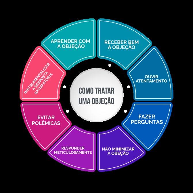 Nada derrota um vendedor inexperiente mais rápido do que uma objeção inesperada 65% dos vendedores desistem logo após a primeira objeção Não faça parte dessa estatística Mas como então desenvolver essa habilidade falando de objeções? Como agir com assertividade diante de tantos detalhes? Algumas atitudes, tomadas na sequência correta, podem permitir que os profissionais de vendas possam lidar com eficiência em diferentes cenários de objeção, como esquematizado no diagrama abaixo: