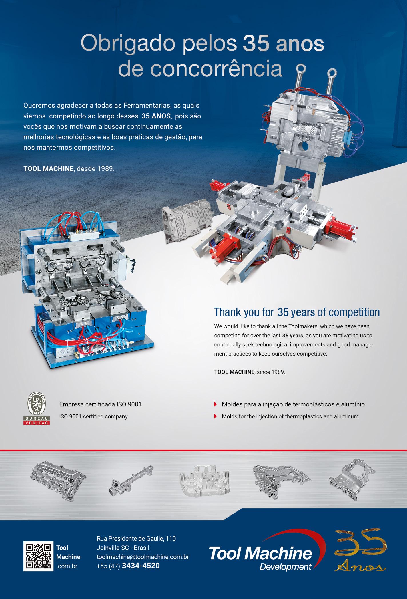 modo, podemos dizer que somos especialistas em tryout de moldes. Nosso objetivo é oferecer a melhor solução para nossos clientes da linha automotiva, duas rodas, linha branca, entre outras”. Ele completa: “todo o nosso know-how das operações de tryout, aplicado na injeção de termoplásticos para linha branca e linha automotiva garante resultados de alto nível, com grande eficiência”. A qualidade final está no foco da empresa, que procura se destacar no mercado com a adoção de práticas arrojadas, inovação tecnológica, setup otimizado, profissionais diferenciados e comprometimento com as necessidades dos seus clientes.