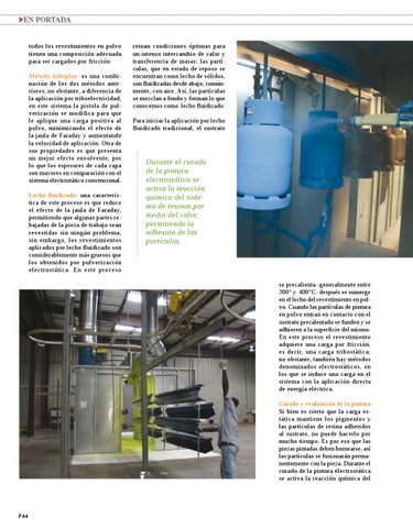 EN PORTADA todos los revestimientos en polvo tienen una composición adecuada para ser cargados por fricción. Método triboplus: es una combinación de los dos métodos anteriores; no obstante, a diferencia de la aplicación por triboelectricidad, en este sistema la pistola de pulverización se modifica para que le aplique una carga positiva al polvo, minimizando el efecto de la jaula de Faraday y aumentando la velocidad de aplicación. Otra de sus propiedades es que presenta un mejor efecto envolvente, por lo que los espesores de cada capa son mayores en comparación con el sistema electrostático convencional. Lecho fluidizado: una característica de este proceso es que reduce el efecto de la jaula de Faraday, permitiendo que algunas partes rebajadas de la pieza de trabajo sean revestidas sin ningún problema, sin embargo, los revestimientos aplicados por lecho fluidizado son considerablemente más gruesos que los obtenidos por pulverización electrostática. En este proceso