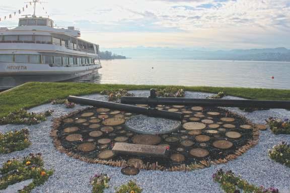 Na foto acima um barco ônibus batizado de Helvetia ancorado em Bürkliplatz, próximo a ponte Quaibrücke, a ponte tem uma das melhores vistas de Zürich, ponto ideal para fotos.