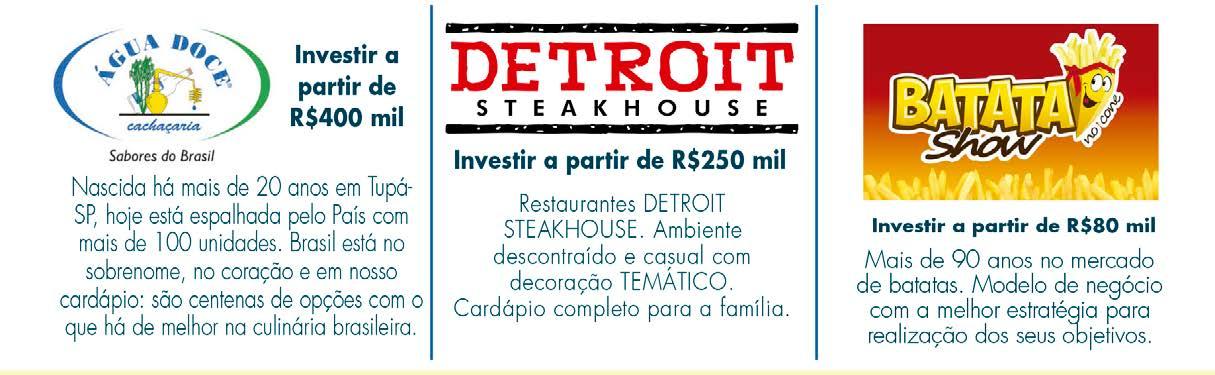 As informações sobre as marcas franqueadoras ou oportunidades de negócios licenciados e suas operações são fornecidas pelas próprias empresas, sendo de sua total responsabilidade. A Revista recomenda a seus leitores uma pesquisa rigorosa junto a cada marca, busque sites especializados, a ABF- Associação Brasileira de Franchising e procure alguns franqueados ou licenciados que já operem nas redes que despertarem seu maior interesse. Fazendo, assim, um levantamento minucioso no mercado antes de optar por um novo investimento. Disponibilizamos a cada trimestre, informações para uma pesquisa inicial, apresentando de forma interativa, e detalhada várias opções de negócio dentro de cada segmento, para facilitar sua busca. Boa leitura.