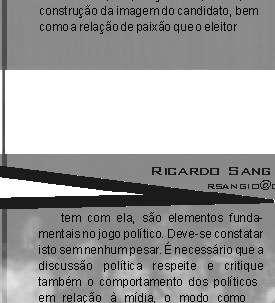 em relação à mídia, o modo como aparecem, o que tentam passar e de que modo o fazem. O mesmo se aplica ao comportamento do eleitor: que tipo de aparência lhe agrada e os porquês desta satisfação, se há um equilíbrio entre ideologia, proposta e imagem do candidatoescolhido.