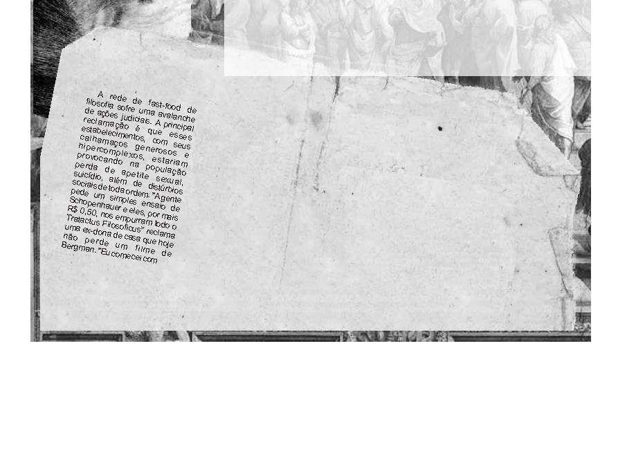 desenvolvemos uma forma de trazer filosofia de qualidade para todos que possam pagar por ela. Em nossas lojas, vendemos filósofos para todos os gostos: Descartes para os clientes mais conservadores, Maffesoli para os ciber-modernosos e Derrida para aqueles com problemas de adaptação social. Além disso, temos outros produtos como barbas postiças e óculos de aro grosso, para tornar a imersão do cliente no mundo da filosofia ainda mais completa. Atualmente, nosso campeão de vendas é o Mc Niilismo Infeliz uma caixinha lúgubre que contém as últimas obras de Nietzsche e uma cartela de Prozac como brinde.